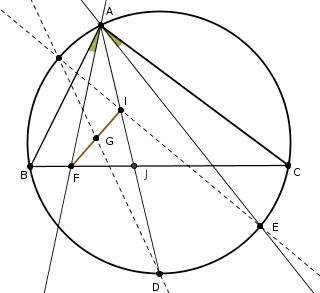 Regresando a la pregunta original. Queremos probar que $DG$ y $EI$ concurren en $\Gamma$, entonces, para ello bastará probar que el ángulo $IDG$ es igual al ángulo $AEI$. Para probar esta igualdad demostraremos la siguiente igualdad de razón de senos: \frac{\textrm{sen}(\angle IDG) }{\textrm{sen}(\angle GDF) } = \frac{\textrm{sen}(\angle AEI) }{\textrm{sen}(\angle IEJ) }