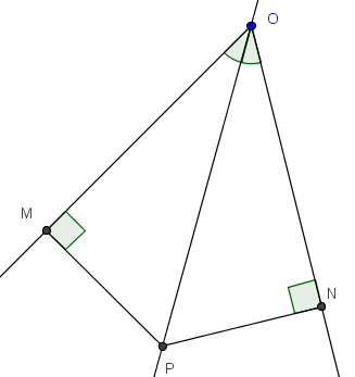 Con referencia a la figura, $P$ es equidistante de las rectas $OM$ y $ON$ si y sólo si los ángulos $MOP$ y $PON$ son iguales --por el teorema del cateto y la hipotenusa y el criterio $ALA$ de congruencia de triángulos.