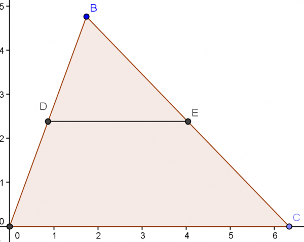 Ok me gusta mas mi imagen hahahah, $A(0,0) ,B(b,c) ,C(a,0)$ son las coordenadas de los puntos del triangulo y $D(b/2,c/2) y E((a+b)/2, c/2)$ hahaha no supe como ponerlas en la figura. Bueno ya que caza me molesto mucho que no le puedo poner numeros y no se como quitarselos imaginense que no hay. Ya, bueno la pendiente de $AC=0$ y la pendiente de $DE=((C-C)/2)/(b/2)-(a+b)/2))=0$ entonces son paralelas, y la distancia de $AC=\sqrt{(a-0)^2+(0-0)^2}=a$ y la distancia de $DE=\sqrt{((a+b-b)/2)^2+((c-c)/2)^2}=a/2$ me pase algunos pasos en las operaciones por que me dio flojera :). Y para los otros lados vendria siendo el mismo procedimiento :p, y  ya queda demostrado con analitica, creo que es asi ;p.Me emocione con los parentesis yeaaaaa.