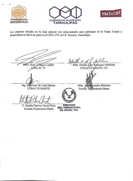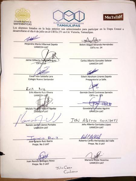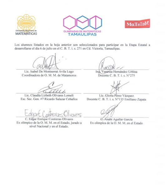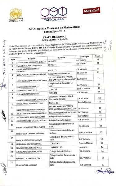 Aclaración 2: Con respecto al acta de Nuevo Laredo, publicada en el facebook de Olimpiadas de Matemáticas en Tamaulipas, se omitieron los alumnos Diego André González Garduño, Tania Cano Reyes y Gustavo Eduardo Martínez Buentello, quienes obtuvieron 10 puntos.