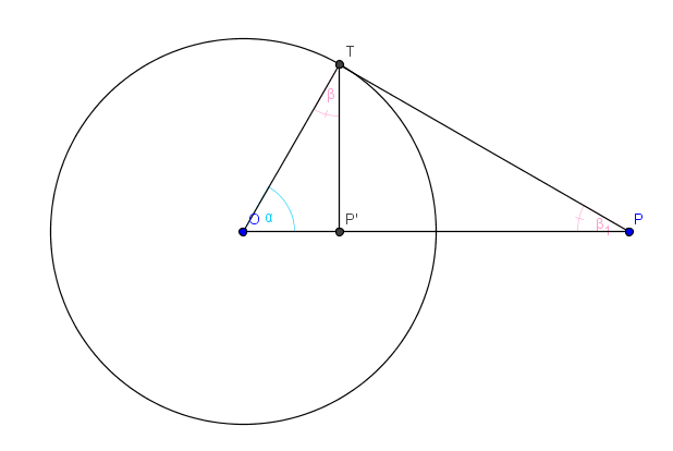 Tenemos que los triangulos OP'T~OTP; notemos que ambos tienen un angulo $\alpha$ y un angulo recto; y por tanto tambien tienen un angulo $\beta$ entonces podemos afirmar que exsisten las razones: OP'/OT=P'T/TP=OT/OP; donde OT=r entonces tenemos que OP'/r=r/OP entonces: OP'(OP)=r^2, por lo tanto P'es el inverso de P respecto a c