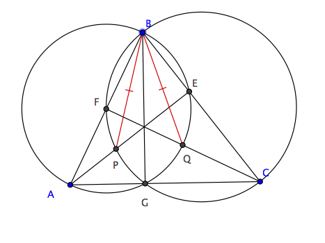 Cabe hacer notar que $BG$ es altura del triángulo ABC. Es fácil notar que los segmentos AE y CF también son alturas, por lo tanto, las tres segmentos coinciden en el punto H, el ortocentro del triángulo ABC.