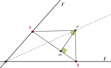 Considere dos rectas $\ell$ y $\ell'$ y un punto fijo P que diste lo mismo de $\ell$, que de $\ell'$. ¿Qué lugar geométrico describen los puntos M que son proyección de P sobre AB, donde A está en $\ell$, B está en $\ell'$, y el ángulo APB es recto.