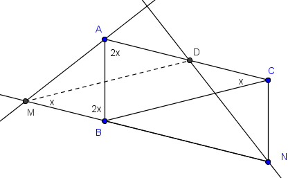 luego, x alternos internos MBA = 2x y NBC = x; tambien el angulo MAB mide 90-x y por tanto BMA mide tmb 90-x. Por tanto, MB = BA = CD.
