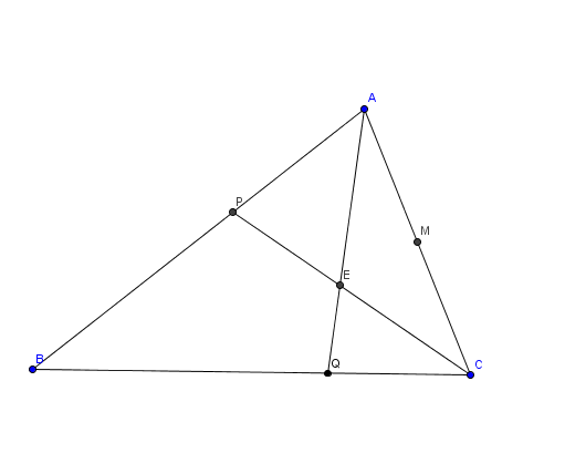 Sea ABC un triangulo, M el punto medio de CA, P el punto donde la bisectriz desde C intersecta a AB; E y Q son los puntos donde una ceviana desde A intersecta a la bisectriz y al lado BC, respectivamnete (Q no esta en la prolongacion de BC). Demuestra que los segmentos PQ y CQ son iguales, si y solo si B, E y M son colineales.