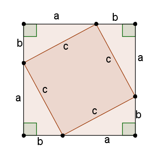 2. El área de este mismo cuadrado es igual a "cuatro veces el área del triángulo rectángulo" más "el área del cuadrado de en medio". $$A=4\frac{ab}{2} + c^2$$